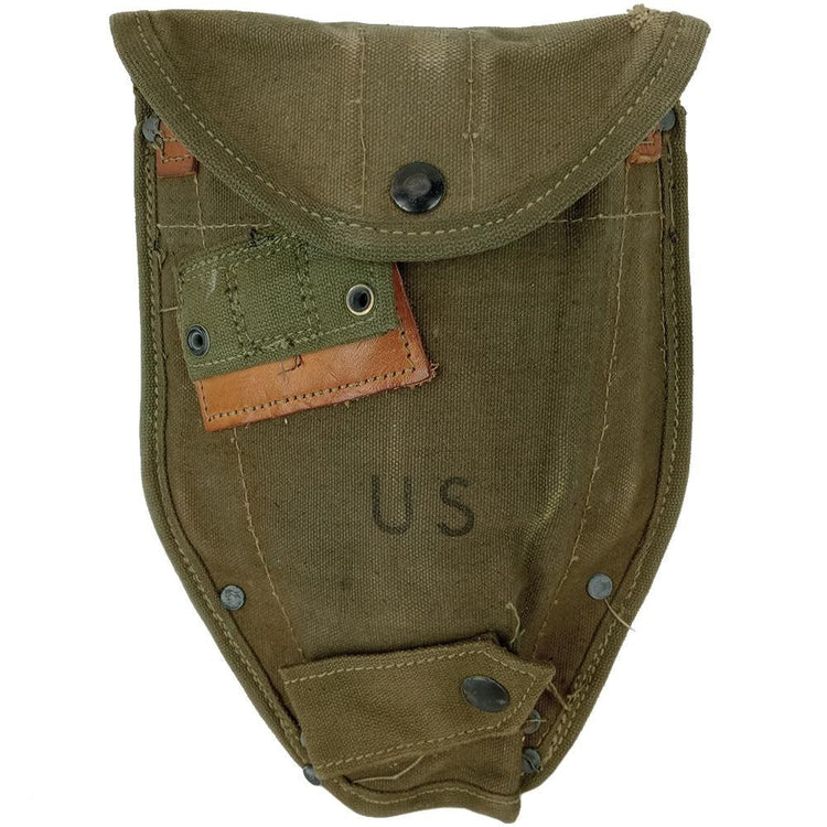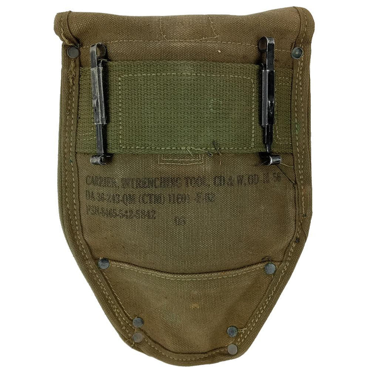 The M1956 Individual Load Carrying Equipment (ILCE) system was adopted after the Korean War and included these shovel covers. ILCE went on to be predominantly used in the Vietnam War and would go on to be used often in combination with its replacement - the ALICE system. Despite its tough canvas build, the material didn't lend itself well to jungle use due to the humidity. A simple snap dome secures your shovel in place while the ALICE clips on the rear secure it onto your web belt, pack, etc.