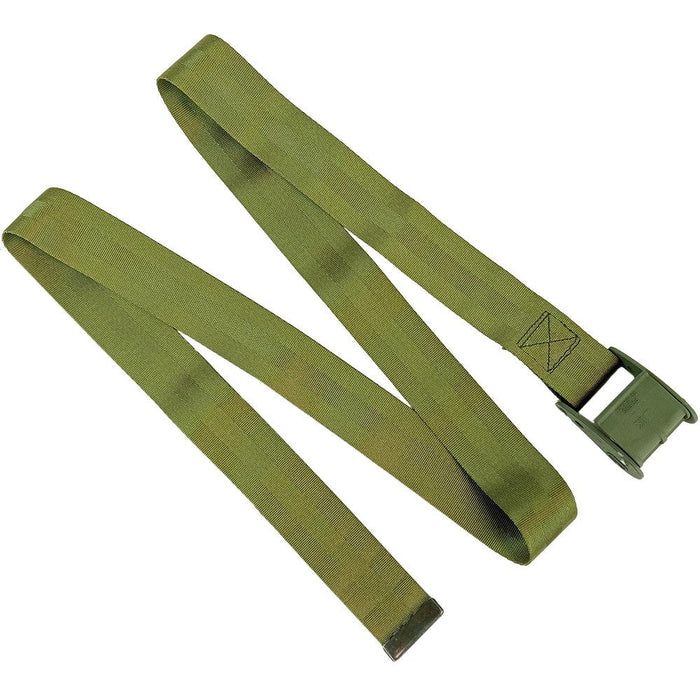 Keep that cargo on lockdown with these nylon utility straps from the US military. These handy things have a metal spring clamp buckle, 5cm nylon strapping and approx. 160-178cm long. To make a strong loop, feed the metal capped end through under the lever and the metal buckle releases the strap when pressing the lever down. With some storage battle damage, like chips on the buckle paint, these are otherwise in very good condition. We can't estimate the strength on these guys though. Holds really firm but it is surplus and who knows what these have been through. Secure the package and off you go.