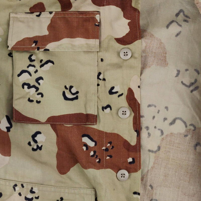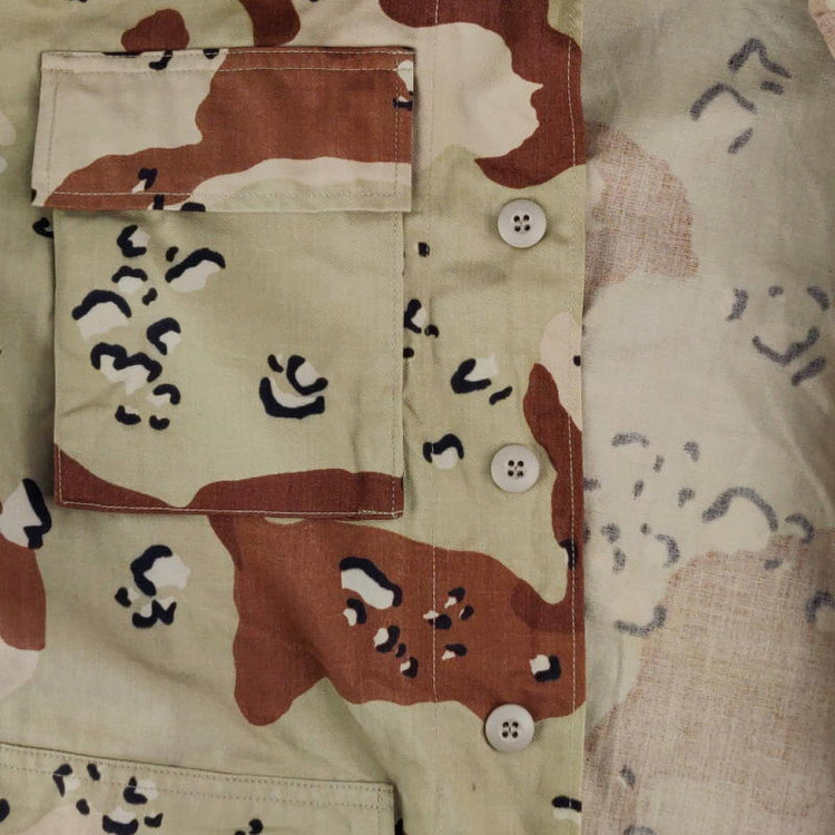 A genuine US Army issue Desert BDU shirt. This shirt and camo pattern has been replicated many times but here you're getting the real deal! The camouflage is known as the six-colour desert pattern, though tastefully nicknamed "Chocolate-chip" or "Cookie Dough" camouflage. Made for use in arid environments and was most notably used during the Persian Gulf War.