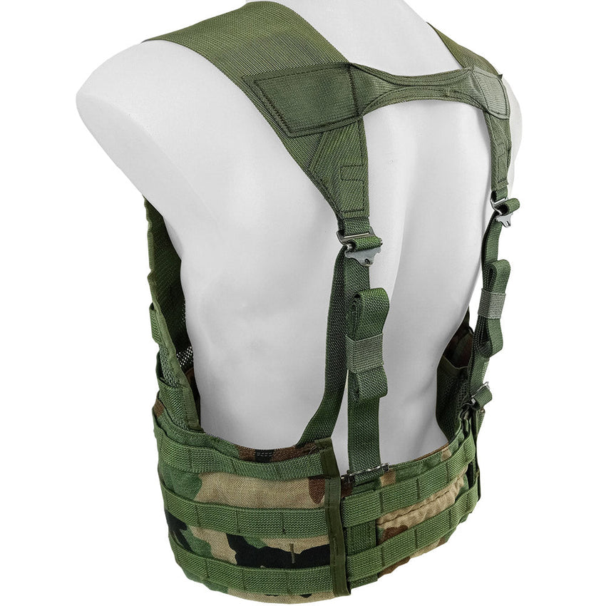 This version either has two quick release buckles to the front or the later generation, having zip front closure. Inside the vest to the sides are two mesh pockets and the woodland pattern covers the lower, belt portion of the vest. The chest is based with sturdy nylon mesh, great for reducing weight and staying cool. Adjustments to fit can be made near the front buckles and to the back at two points each side.