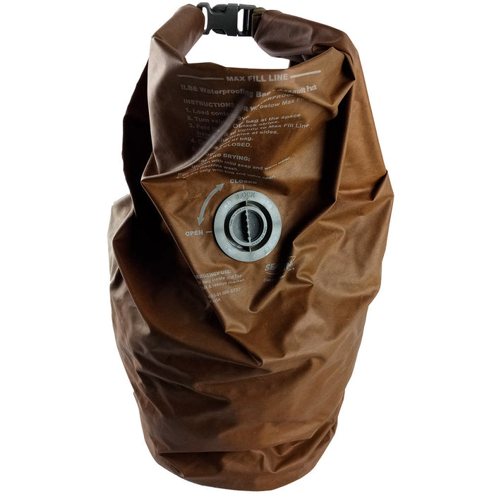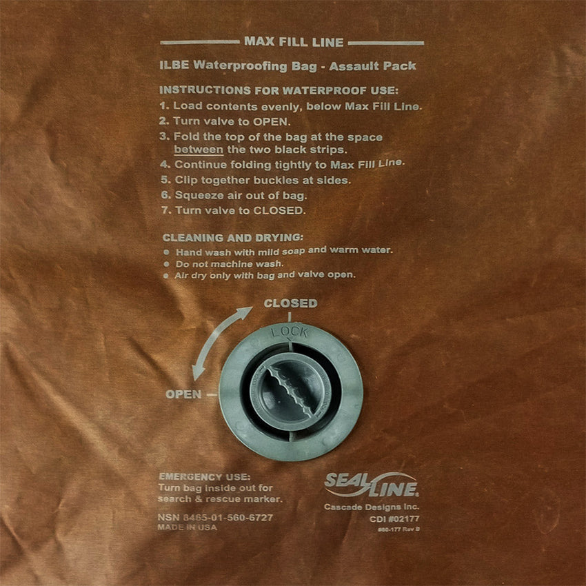 This 56L waterproofing bag was made to fit inside the ILBE (Improved Load Bearing Equipment) assault pack. Keep your gear dry by putting it in the sack and following the concise instructions on the outside (see second picture).