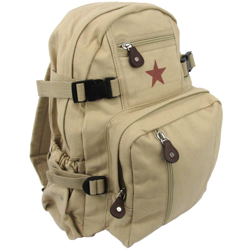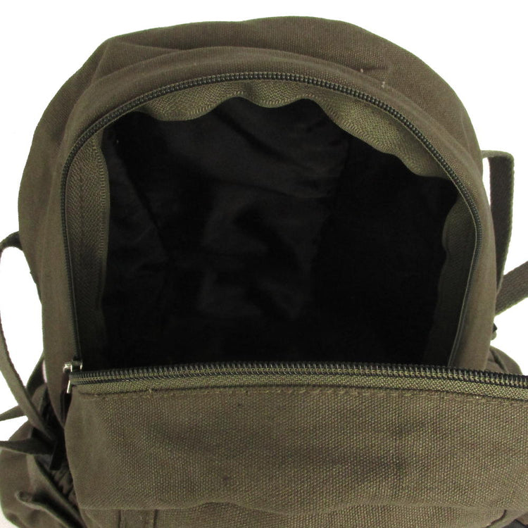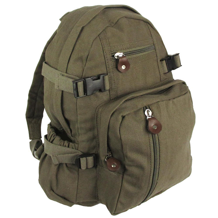 Rothco's canvas backpack combines a vintage look and feel with a compact design to survive a day in the modern life. Constructed from cotton canvas with leather accents and metal zips. A good size for carrying your gear to work, school or on day hikes.